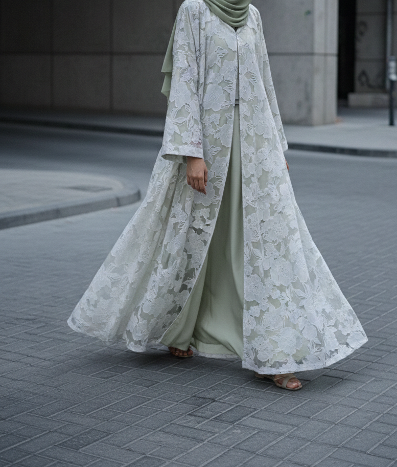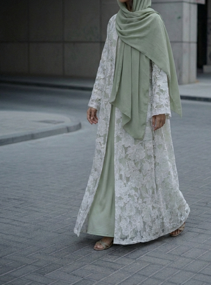 An everyday piece in a refreshing, muted green featuring an intricate all-over floral pattern. Made from soft organza cotton with a full chiffon lining, it is built for daily ease and flexibility. The straight-cut silhouette moves fluidly, holds its shape through regular wear, and requires minimal care. It is a straightforward, functional design that fits naturally into any wardrobe, at any age.
