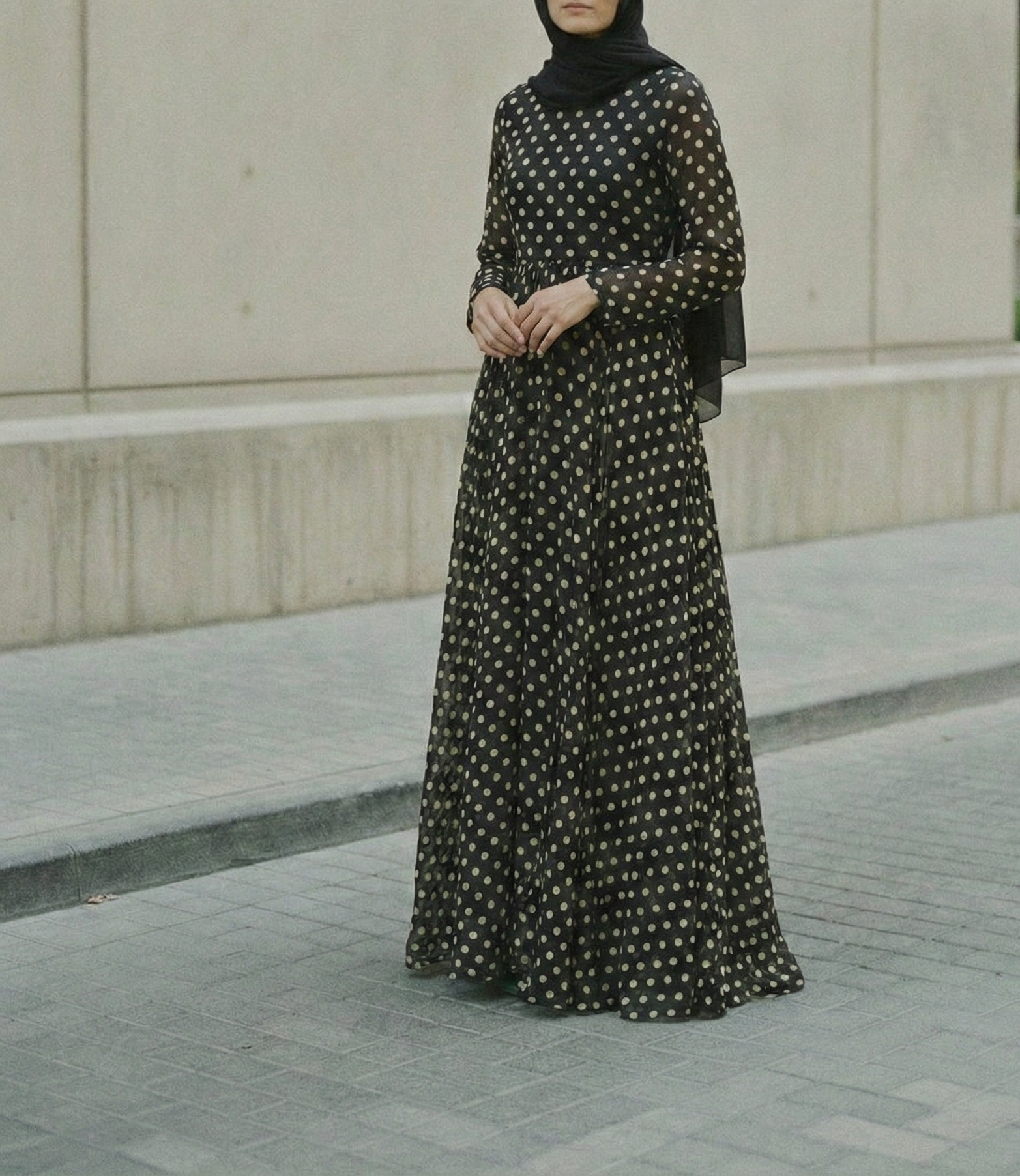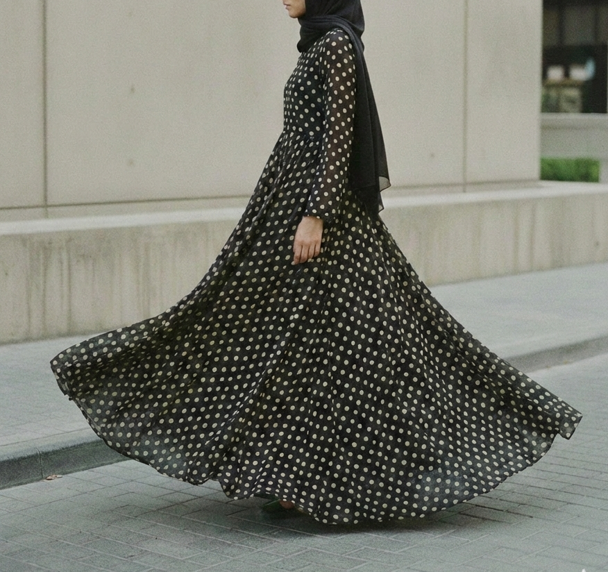 An everyday dress-style piece featuring a classic polka dot print on a dark, versatile base. Made from soft chiffon with a full black lining, it is built for daily ease and flexibility. The silhouette is designed for fluid movement and a comfortable fit that adapts naturally to your routine. The durable fabric holds its shape through regular wear and requires minimal care, making it a straightforward, functional choice for any age.