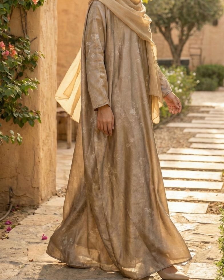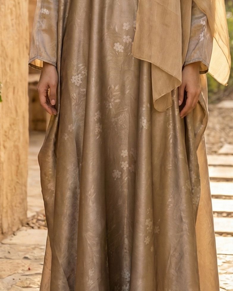 Bathe in luxury with this exquisite champagne gold abaya, designed to capture the light with every movement. The premium fabric boasts a lustrous sheen and is woven with a delicate, tonal floral pattern that adds texture without overwhelming the eye. Its voluminous, flowing silhouette offers a regal presence, perfectly complemented by a matching sheer beige sheila that drapes softly for an ethereal finish.