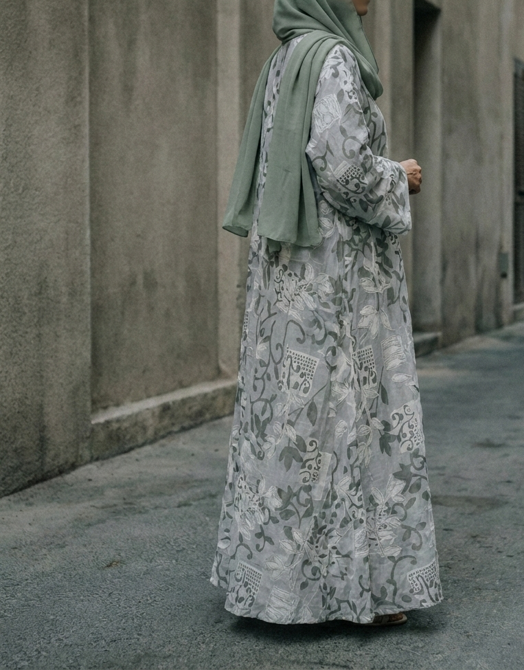 An everyday piece in a muted, neutral tone, featuring a delicate floral overlay. Made from soft organza cotton with a full chiffon lining, it is built for daily ease and flexibility. The straight-cut silhouette moves fluidly, holds its shape through regular wear, and requires minimal care. It is a straightforward, functional design that fits naturally into any wardrobe, at any age.