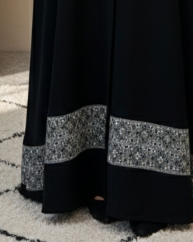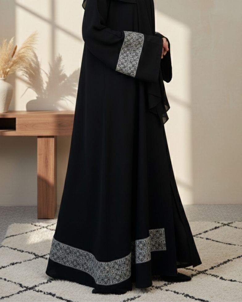 A refined black abaya designed with understated slate-grey textured trims on the sleeves and hem for a modern, elegant finish. Crafted in a fluid silhouette, this piece offers comfort, grace, and effortless modesty—ideal for everyday wear and elevated occasions alike. Comes with a matching black sheila for a perfectly coordinated look.