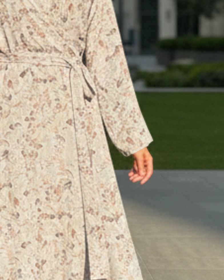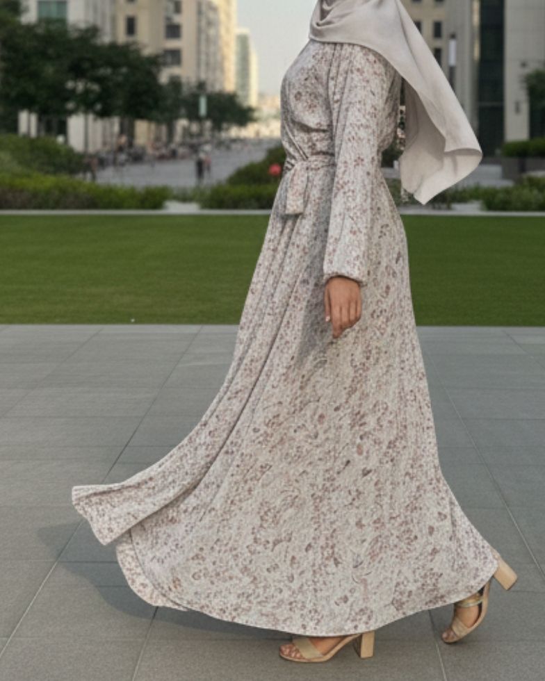 A refreshing take on daily modest wear, this abaya is defined by its comfortable A-line structure that offers a relaxed yet flattering drape. The design is enhanced by an adjustable waist tie made from the matching fabric, allowing you to cinch the silhouette to your preference while maintaining a structured look. Adorned with a subtle, earthy floral print on a light base, it brings a touch of nature to the city streets. Paired with a matching solid light grey soft chiffon sheila sized 26 x 81 inches.