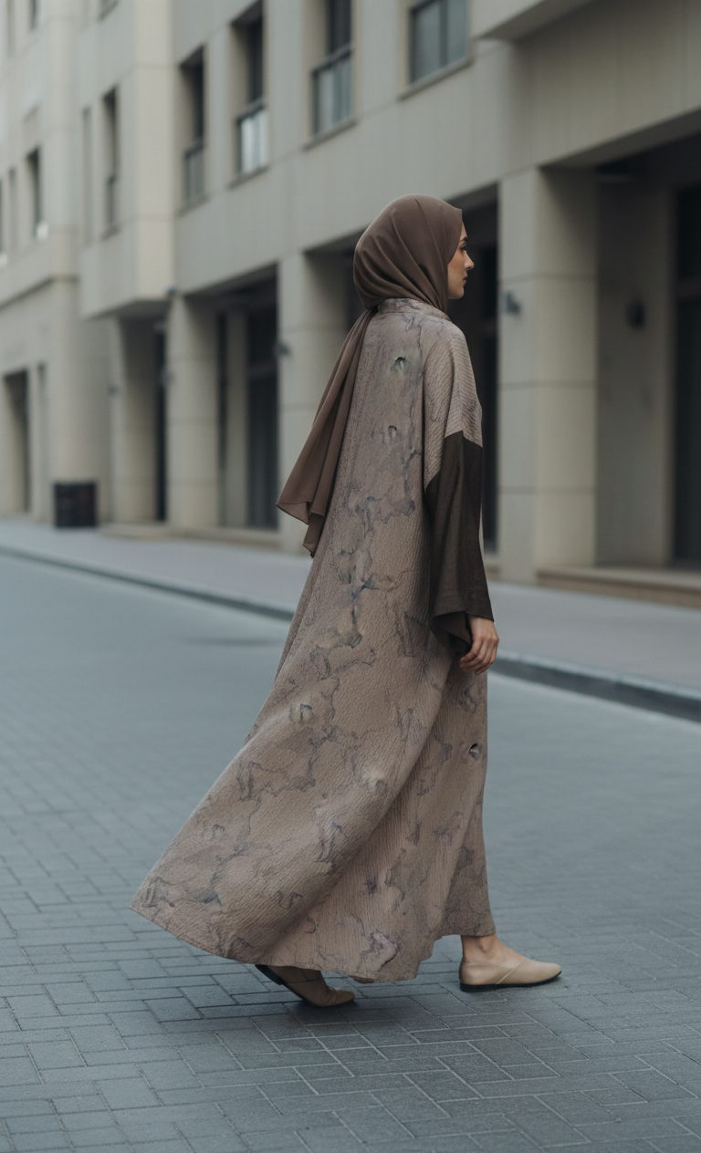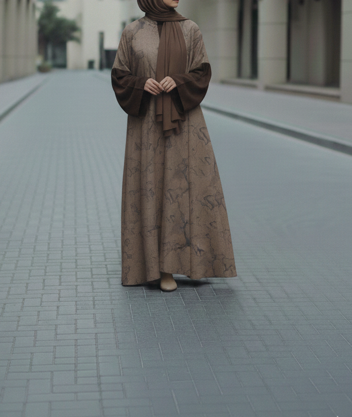 An everyday piece featuring a subtle, sketch-like print on a warm earthy base, distinguished by contrasting dark brown sleeves. Made from soft, textured cotton, it is breathable and built for daily ease and flexibility. Adapt it to your routine: wear it fully buttoned for a clean look, completely open as a light overlay, or secured just at the top for a relaxed drape. The durable fabric moves fluidly, holds up to regular wear, and requires minimal care. It is a straightforward, functional design that fits naturally into any wardrobe, at any age.